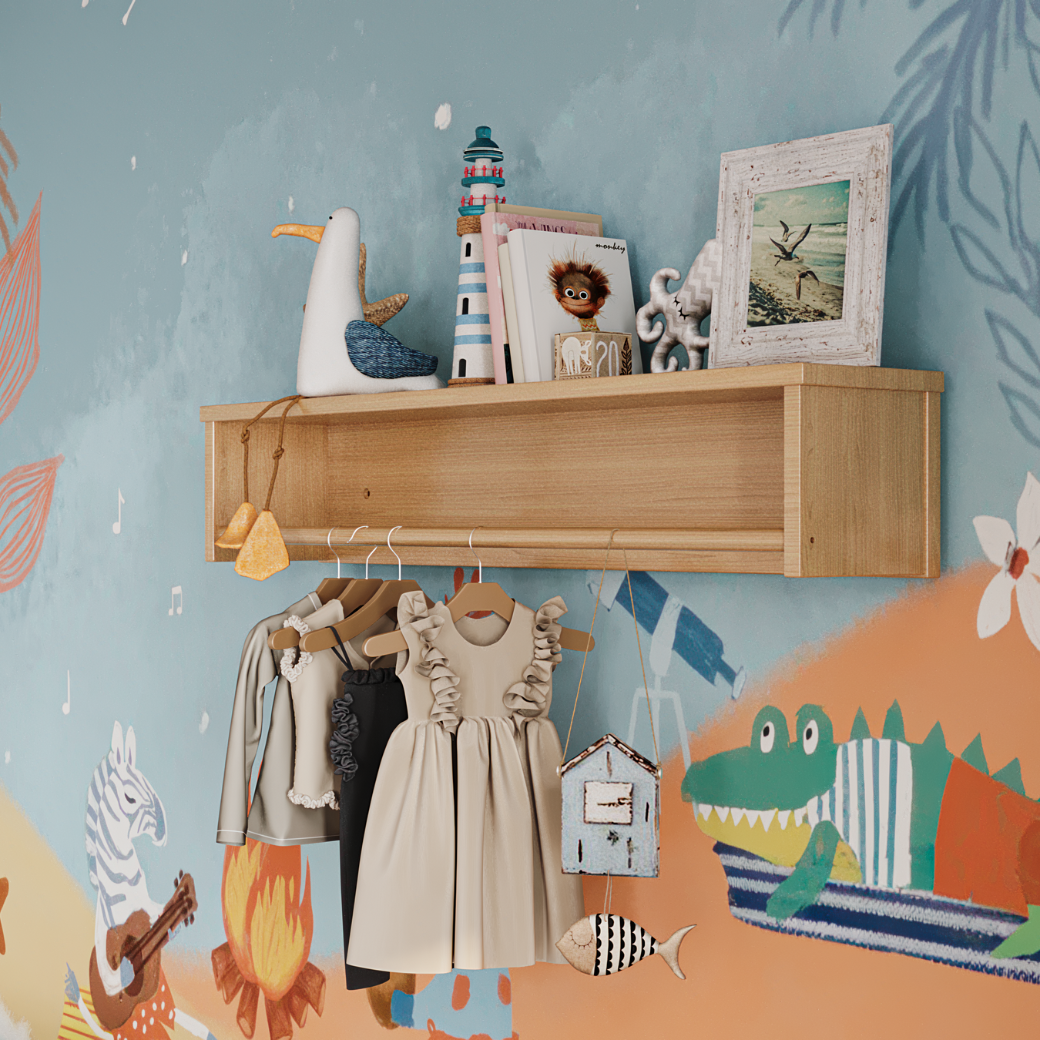 Isso libera espaço no piso e mantém os itens da criança sempre à vista.