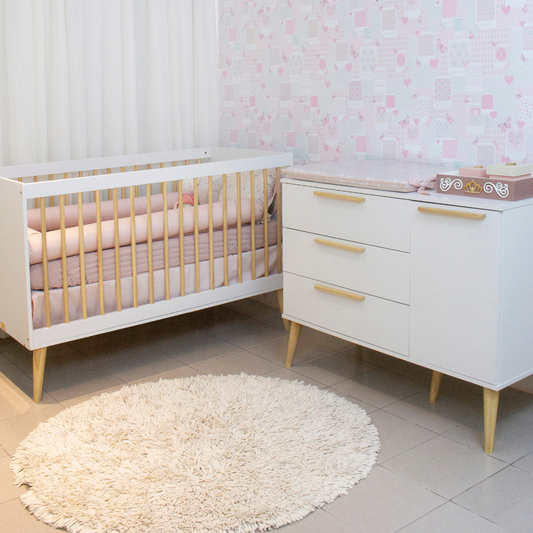 Nossos berços 2 em 1 têm tamanho padrão americano. Após o uso como berço, transformam-se em uma charmosa mini cama infantil — as barras de conversão já acompanham o produto, dispensando a compra separada. Fabricados em MDF e madeira Pinus de reflorestamento.