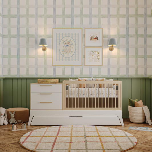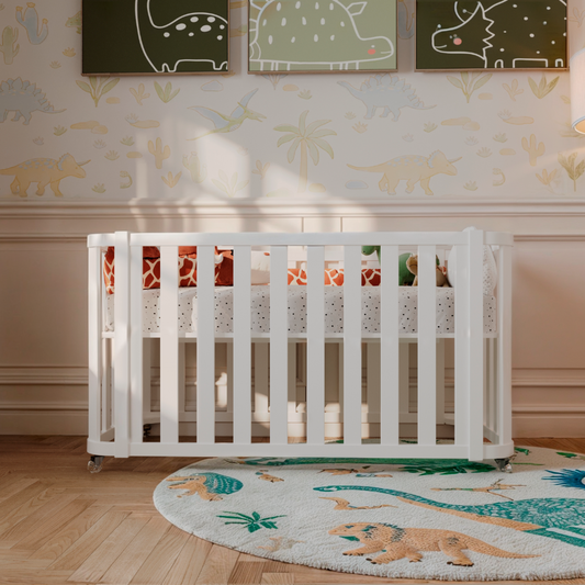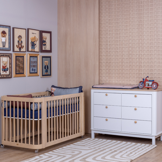 Nossos berços 2 em 1 têm tamanho padrão americano. Após o uso como berço, transformam-se em uma charmosa mini cama infantil — as barras de conversão já acompanham o produto, dispensando a compra separada. Fabricados em MDF e madeira Pinus de reflorestamento.