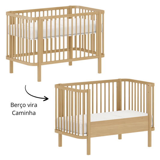 Berço Madeira Maciça 2 em 1 Vira Caminha | Carvalho Malva Linha Kurve
