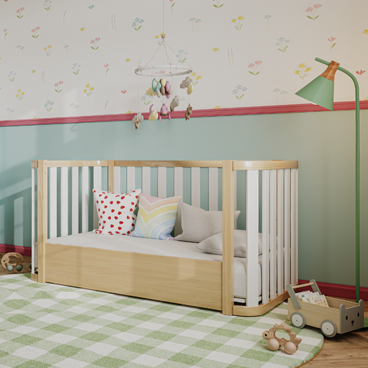 Nossos berços 2 em 1 têm tamanho padrão americano. Após o uso como berço, transformam-se em uma charmosa mini cama infantil — as barras de conversão já acompanham o produto, dispensando a compra separada. Fabricados em MDF e madeira Pinus de reflorestamento.