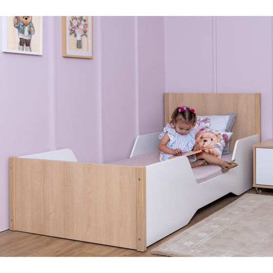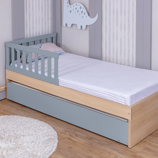 Cama Infantil com Gaveta e Grade de Proteção em Madeira Carvalho Malva – Linha Montessori Modelo Join