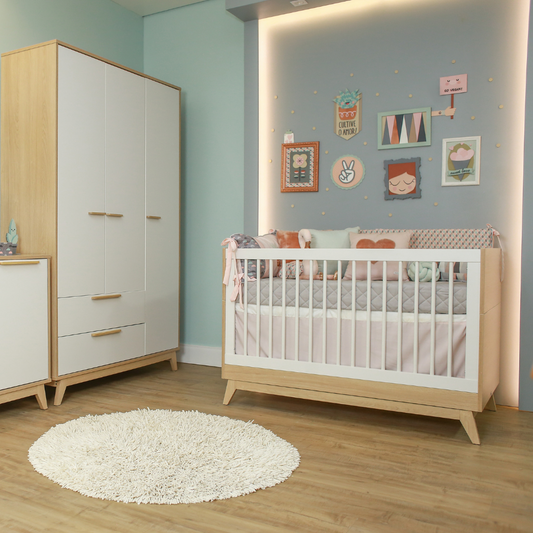 Berço e Guarda Roupa Infantil para Quarto de Bebê Linha Petit Branco com Carvalho