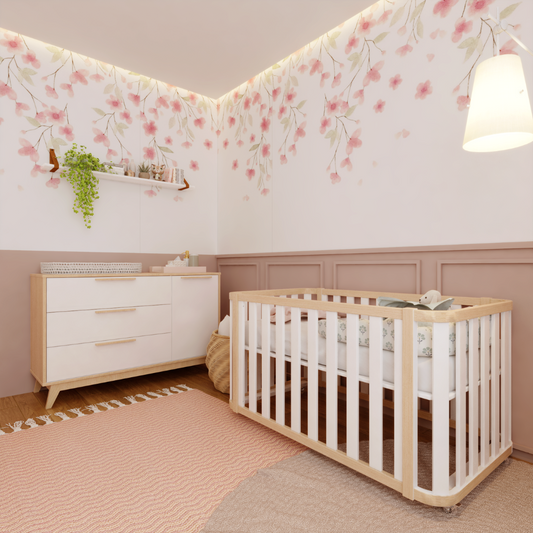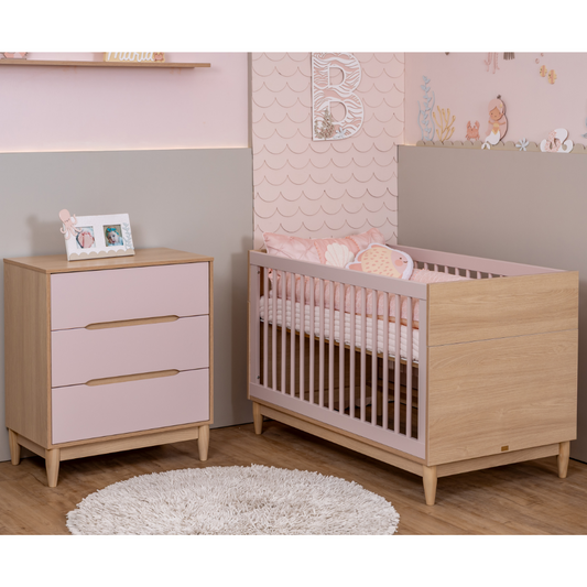 Berço e Cômoda Rosa com Carvalho Malva Linha Tomi