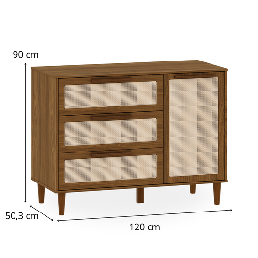 Cômoda Infantil de MDF com Porta e 3 Gavetas – Linha Indy Quater, Detalhes em Rattan 120cm
