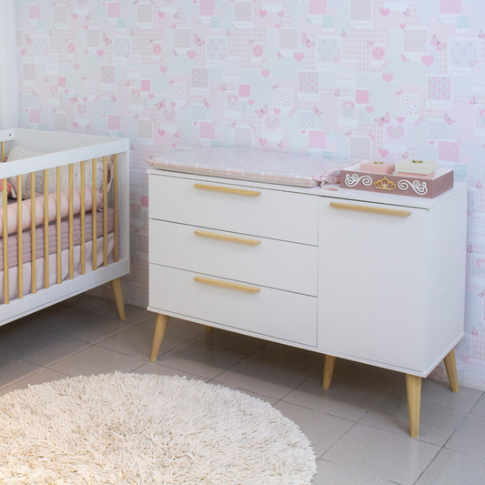 Sim! As cômodas infantis da Quater foram desenvolvidas com altura e profundidade ideal para que também possa ser usada como trocador, oferecendo mais praticidade no dia a dia. Com um tampo firme e seguro, você pode apoiar o trocador e ter tudo à mão nas gavetas, facilitando o momento dos cuidados com o bebê. É um móvel 2 em 1: funcional como cômoda e trocador, sem a necessidade de móveis extras no quartinho.