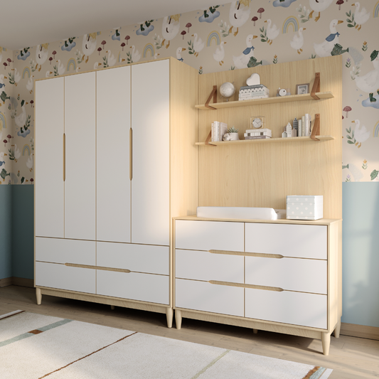 Conjunto Guarda Roupa com Cômoda e Painel com Prateleiras Linha Tomi Branco com Carvalho Malva