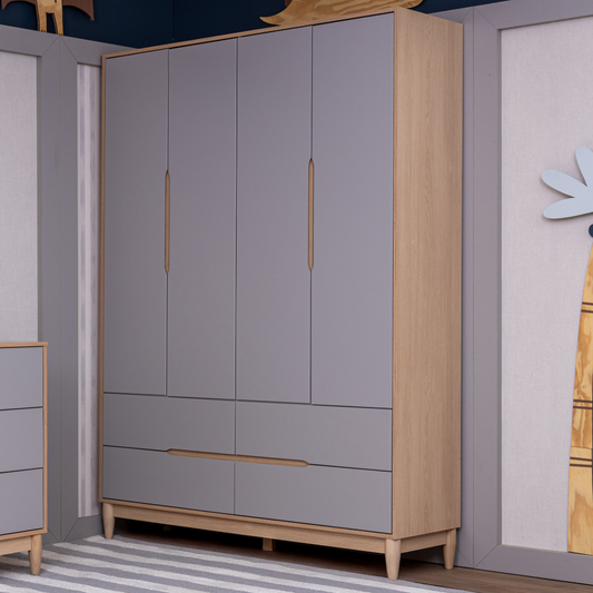 Guarda Roupa Infantil Tomi 4 Portas em MDF Cinza Fosco com Carvalho Malva – Design Minimalista