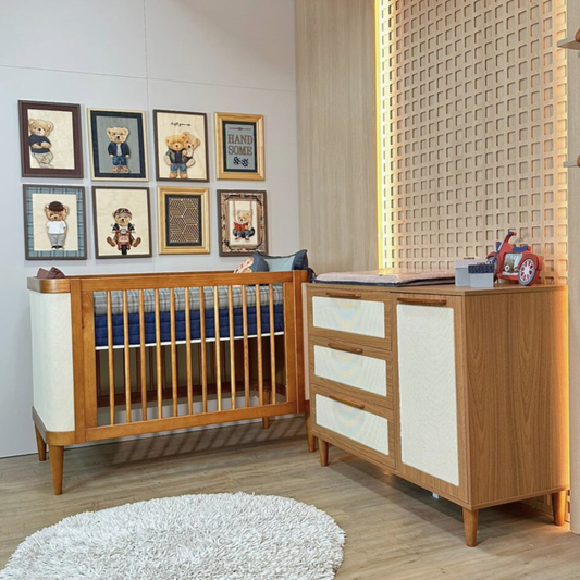 Berço e Cômoda Paglia em Madeira Nogueira com Palhinha Natural
