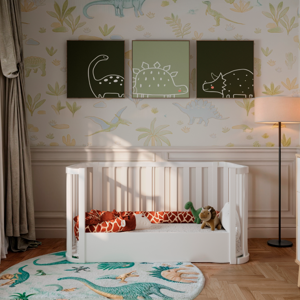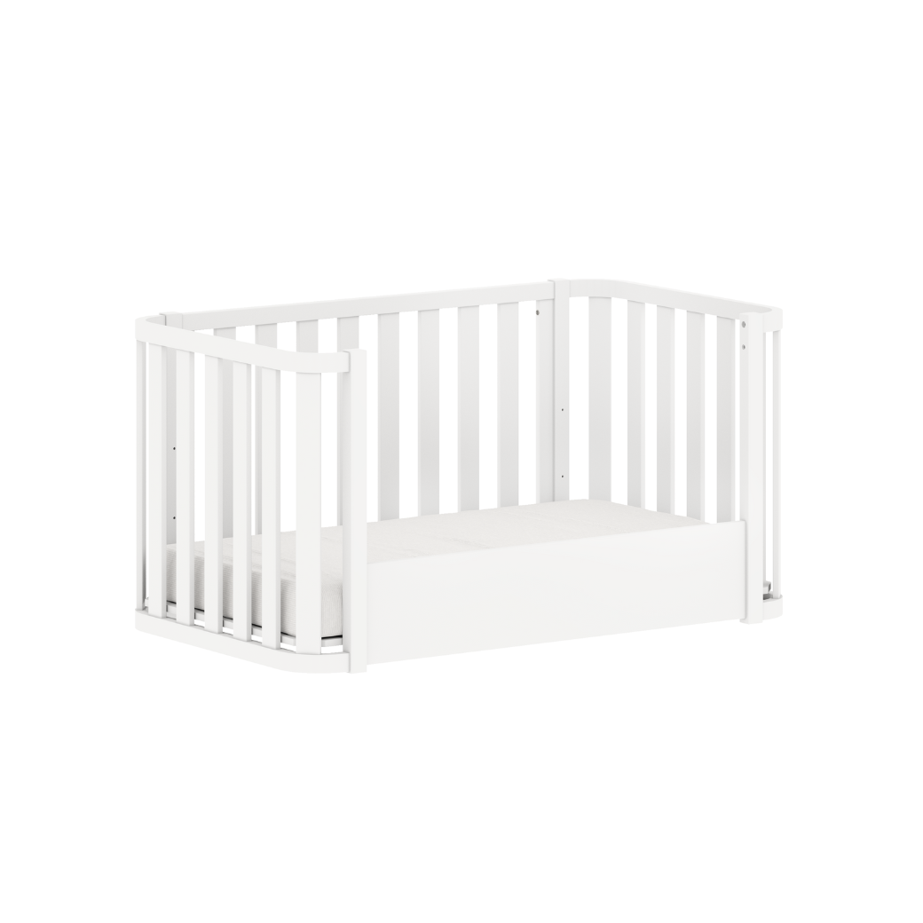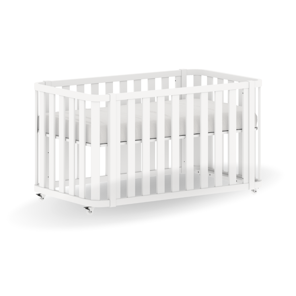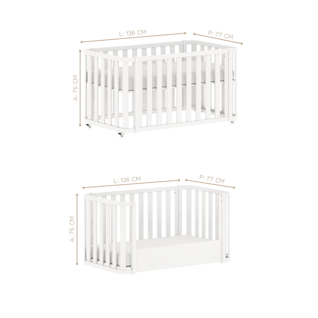 O Berço Branco 2 em 1 Loop é uma ótima opção para compor o quartinho do bebê, ele inicia-se com a montagem do berço americano que possui 3 regulagens de altura de colchão e rodinhas com travas para facilitar a locomoção. Já na segunda fase, ele pode ser transformado em uma caminha para bebê, podendo ser utilizada até os 4-5 anos da criança. Todas as peças para as transformações já acompanham o produto.