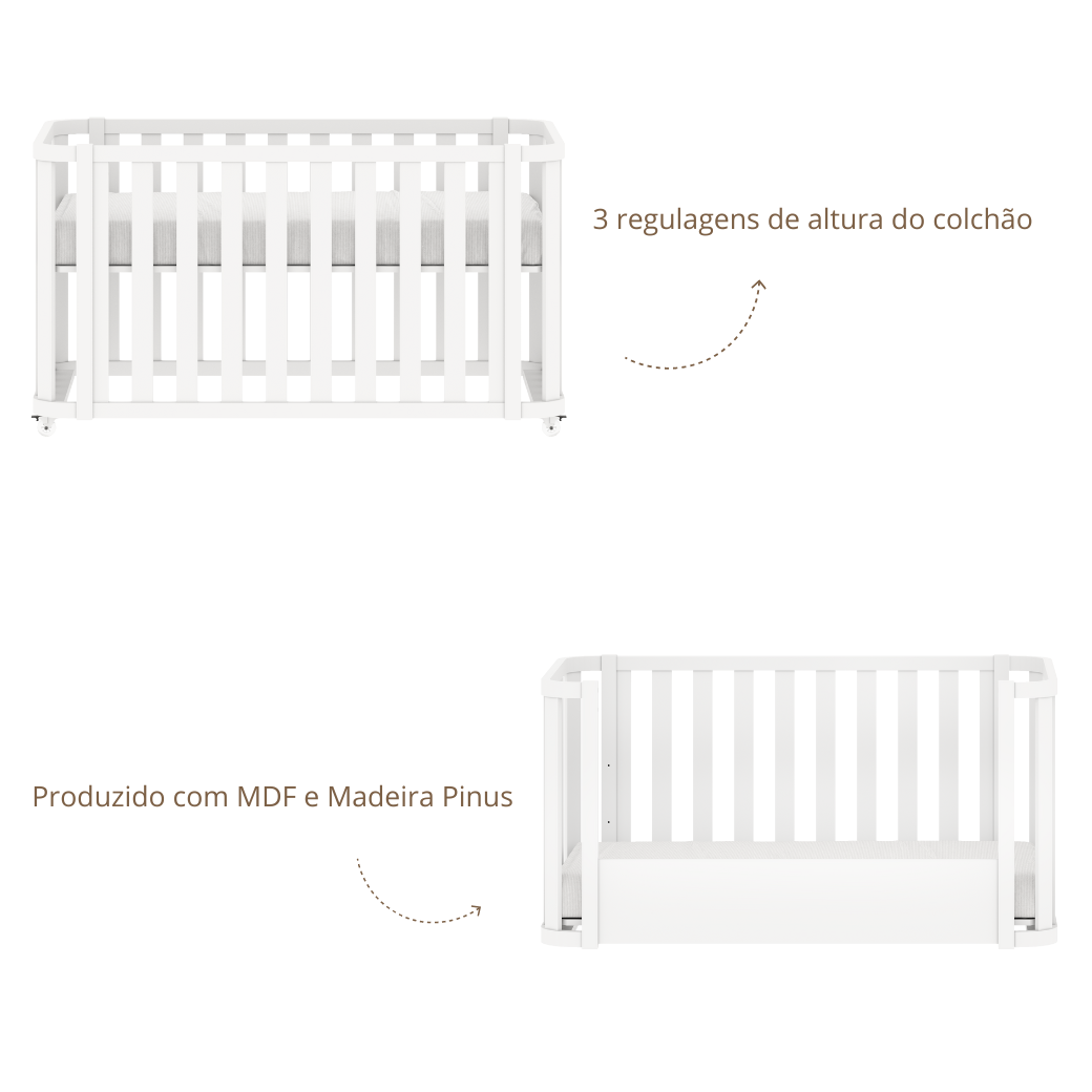 Um berço multifuncional, fácil de combinar com a decoração do quartinho do bebê pois seu acabamento é branco fosco.