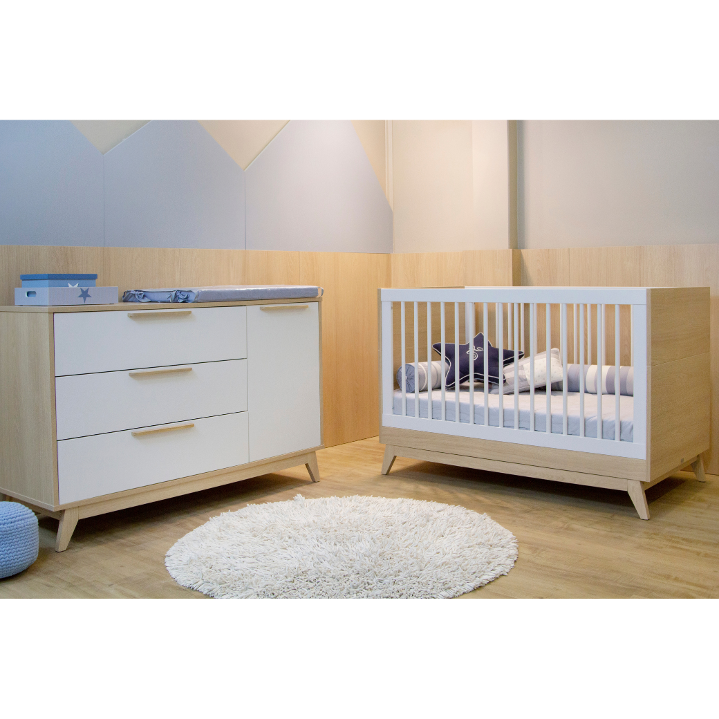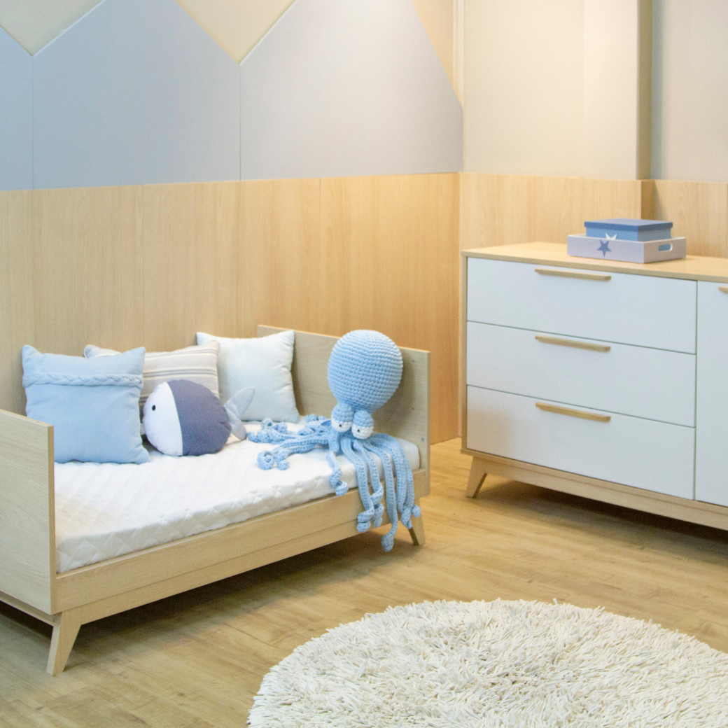 Um berço que se transforma em caminha (Inmetro: 003906/2024)e uma cômoda infantil com porta.
