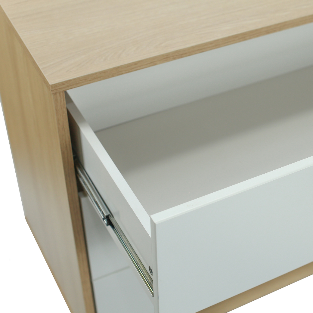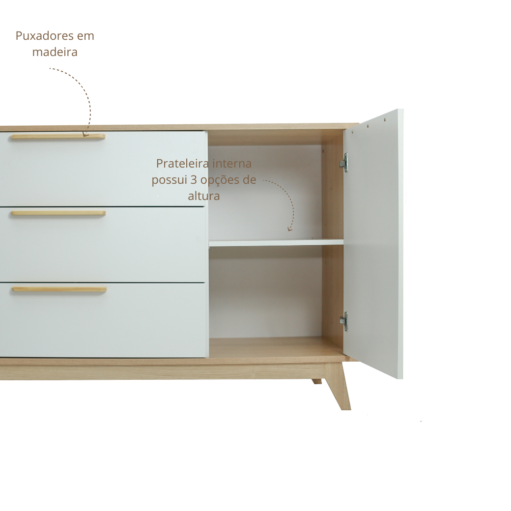A cômoda possui uma porta e é dividida com uma prateleira interna que possui 3 regulagens de altura para utilizar da forma que se adaptar melhor a sua necessidade.