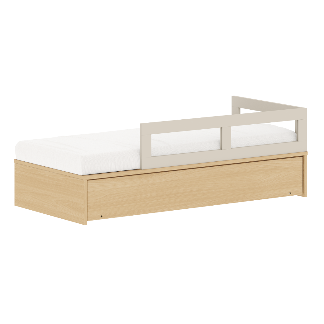 A Cama com Proteção Areia Join, une design moderno, segurança e praticidade. Com estrutura em MDF de alta qualidade e acabamento em tom areia suave, o modelo garante conforto para a criança e tranquilidade para os pais.