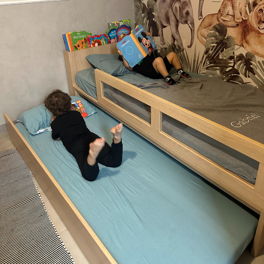 Disponibilizamos essa cama com cama auxiliar no acabamento carvalho malva sendo toda sua estrutura produzida em MDF de alta qualidade, a proteção da cama possui detalhes em acrílicos resistentes.