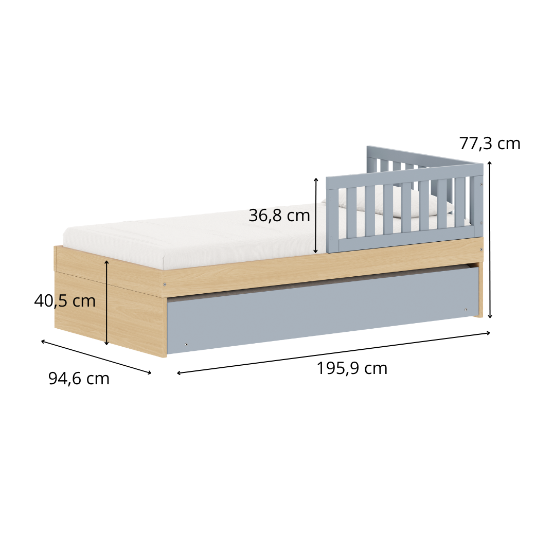 Cama Infantil com Auxiliar em Madeira e MDF, perfeita para otimizar o quarto das crianças com conforto, segurança e praticidade. Com design moderno em madeira clara e detalhes em azul, essa cama oferece proteção lateral com grades, altura segura para os pequenos (40,5 cm do chão ao colchão) e uma cama auxiliar embutida, ideal para receber visitas ou irmãos.