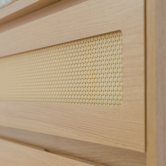 • Tela em Rattan nas gavetas e porta.