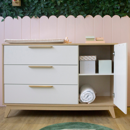A Cômoda Infantil Indy da Quater combina design elegante com alta funcionalidade. Com estrutura em MDF e pés em madeira pinus, conta com 3 gavetas amplas e 1 porta lateral com detalhe em rattan, ideal para manter o quarto do bebê sempre organizado e charmoso.