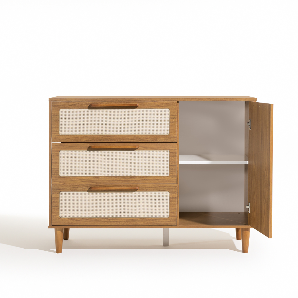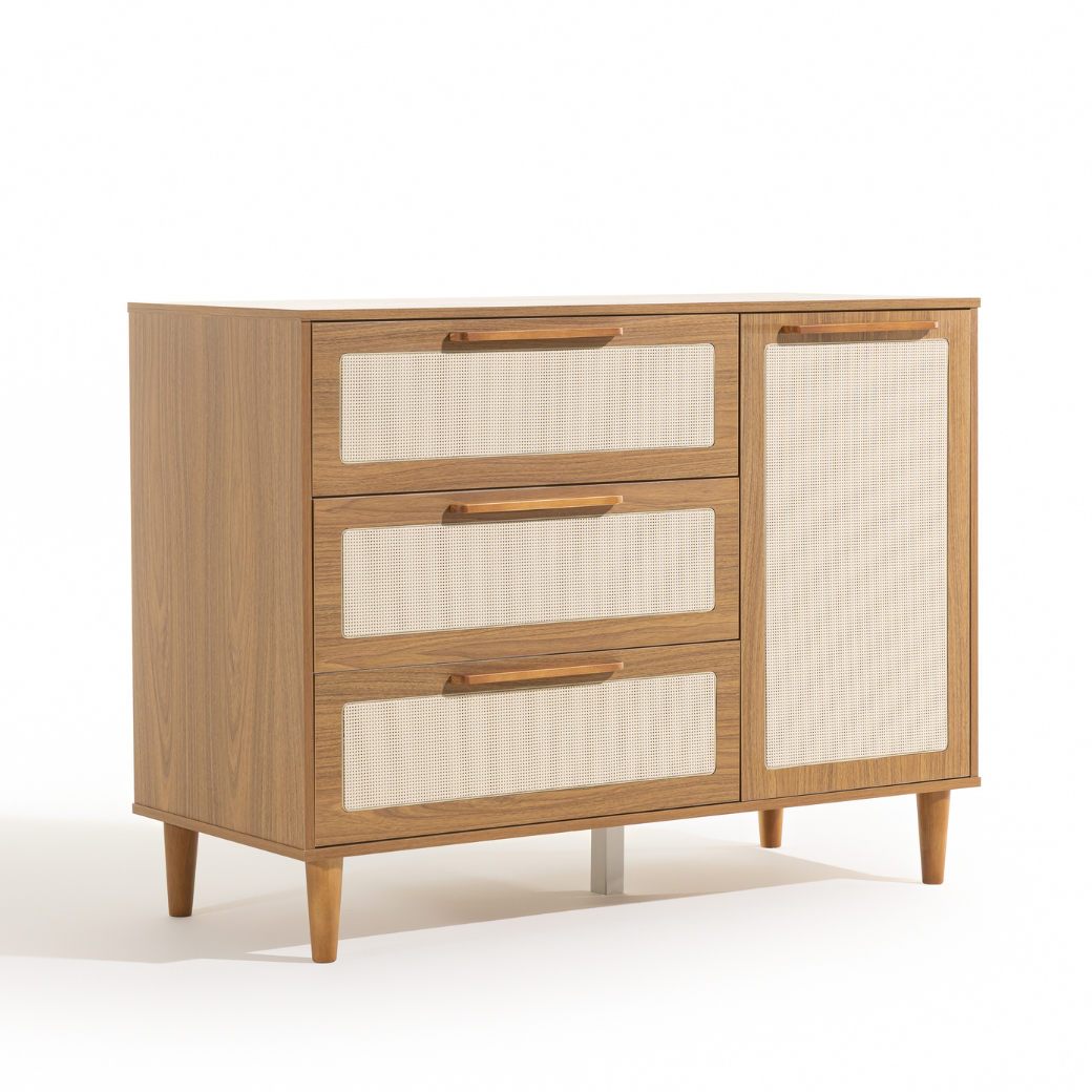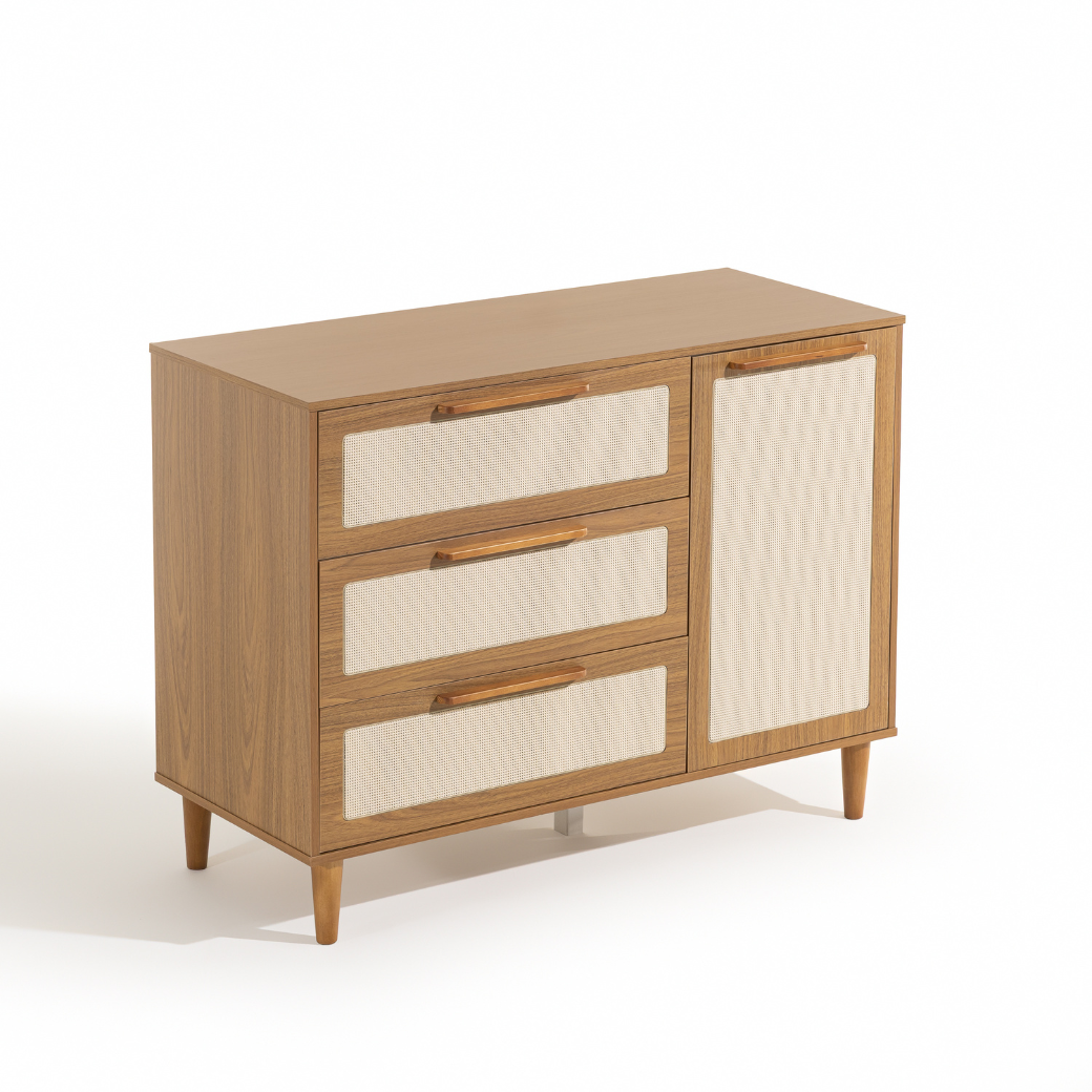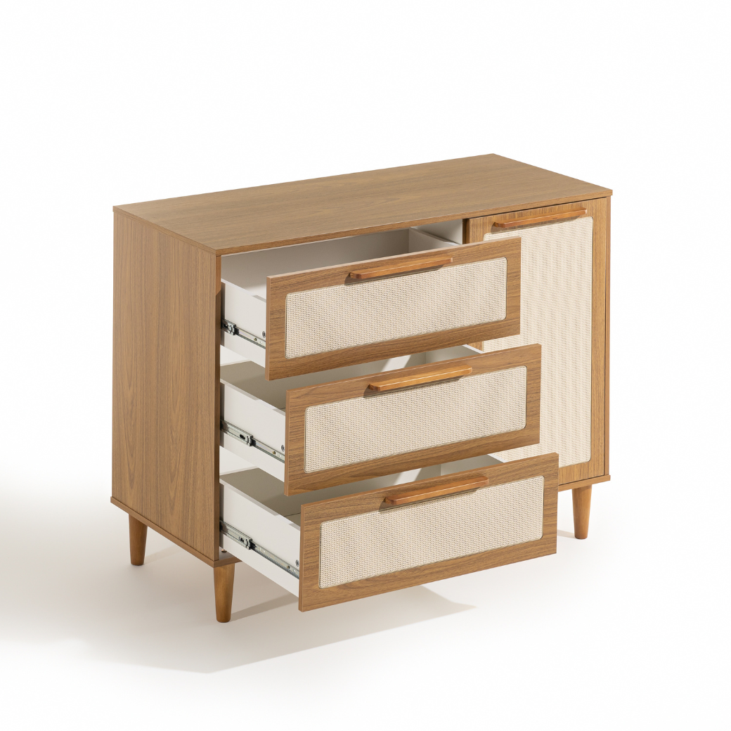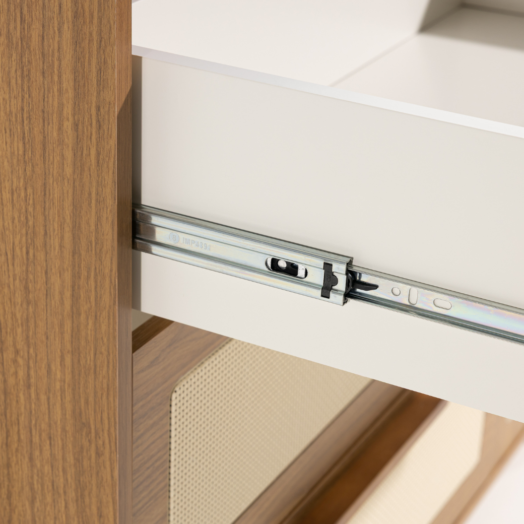 • Tela em Rattan nas gavetas e porta.