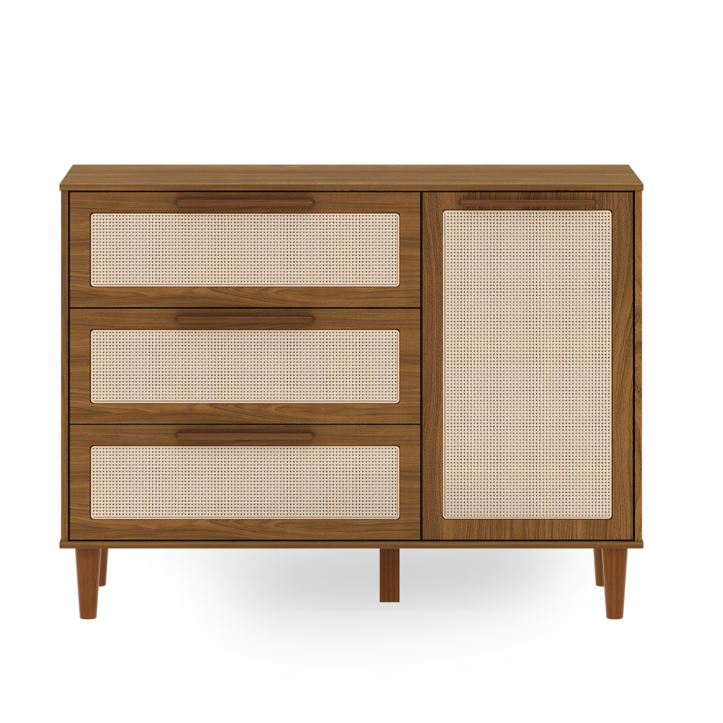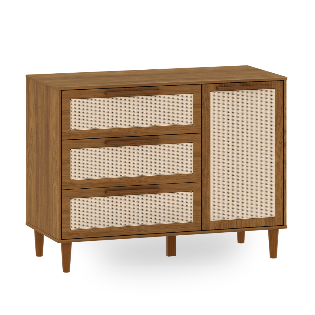 A Cômoda Paglia com porta e prateleira interna é a união perfeita entre elegância, praticidade e design atemporal. Feita em mdf, madeira de reflorestamento e acabamento na sofisticada cor Nogueira, ela traz o charme natural da palhinha nas frentes das gavetas e na porta lateral — um detalhe artesanal que valoriza o ambiente e harmoniza com toda a Linha Paglia.