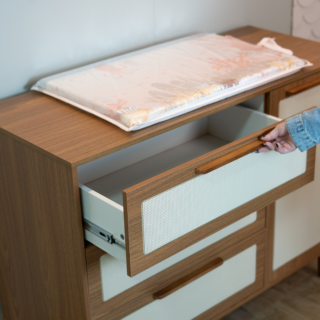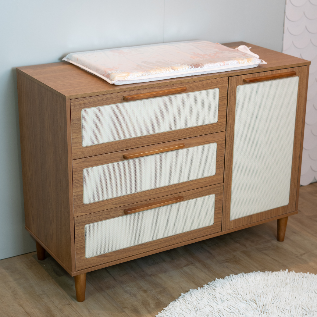 O grande diferencial deste modelo está na porta lateral com prateleira interna, que oferece espaço extra para organizar mantas, fraldas, brinquedos e outros itens essenciais, mantendo o quarto sempre funcional e bem aproveitado.