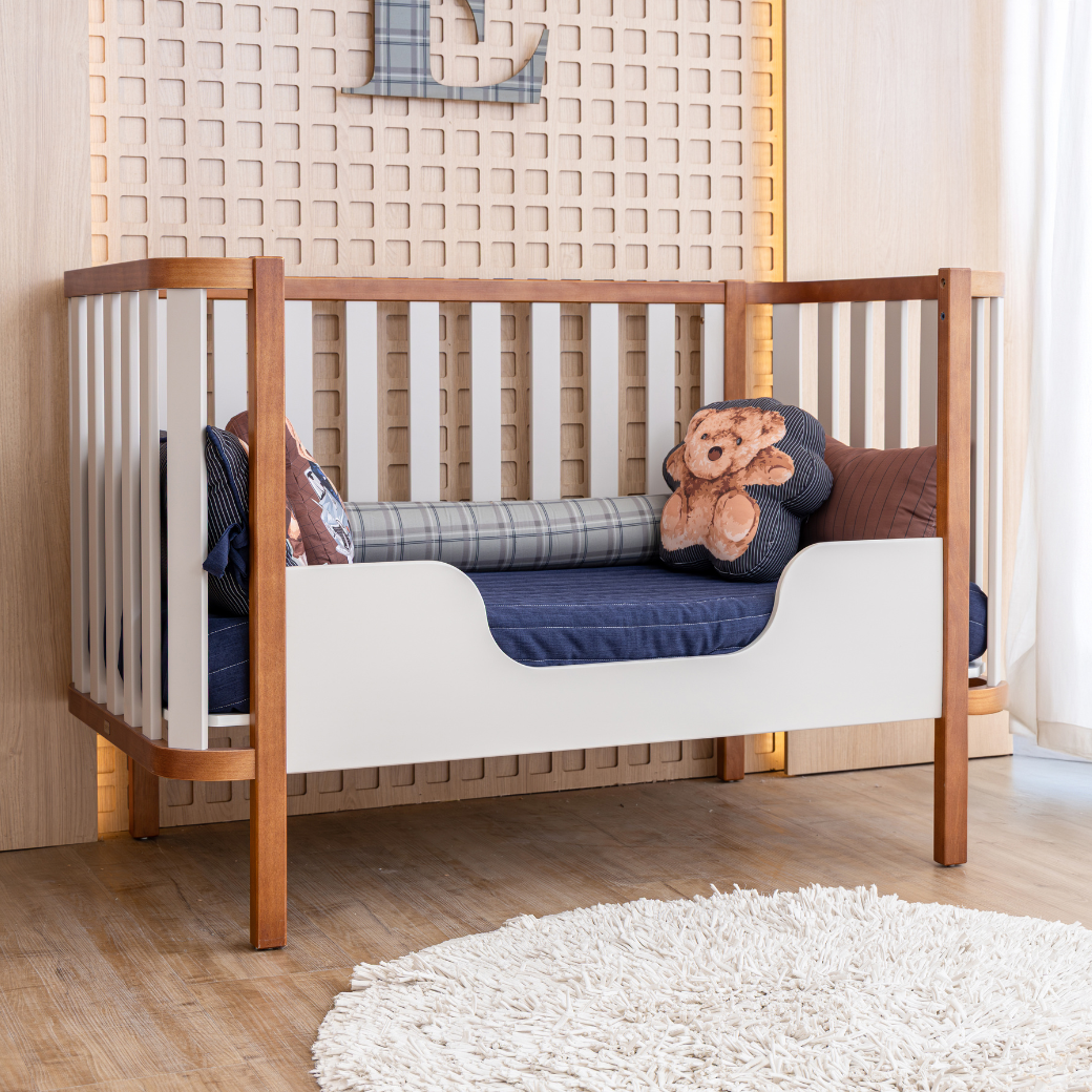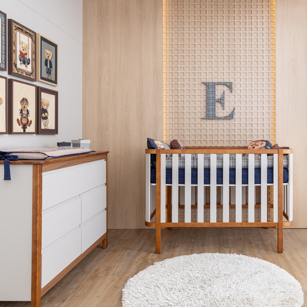 Conjunto ideal para quem busca um quarto de bebê elegante e acolhedor. A combinação da madeira natural escura em tom nogueira com areia cria um visual sofisticado e atemporal, fácil de harmonizar com diferentes estilos de decoração.