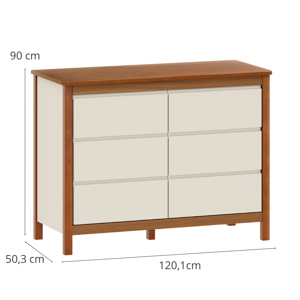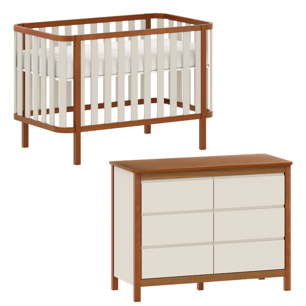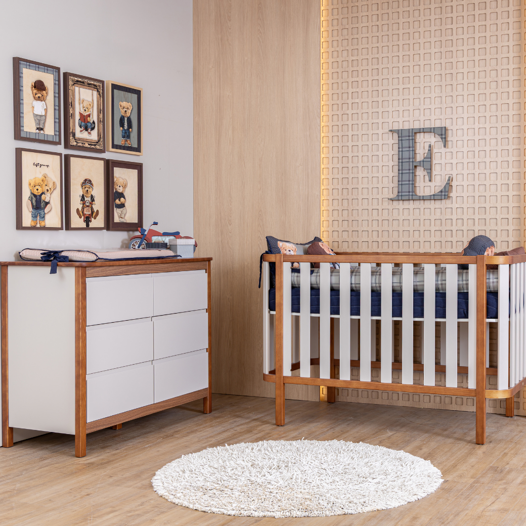 O berço oferece conforto, segurança e ventilação adequada para o bebê. A cômoda, com 6 gavetas amplas, garante organização prática e um tampo funcional para a rotina diária.