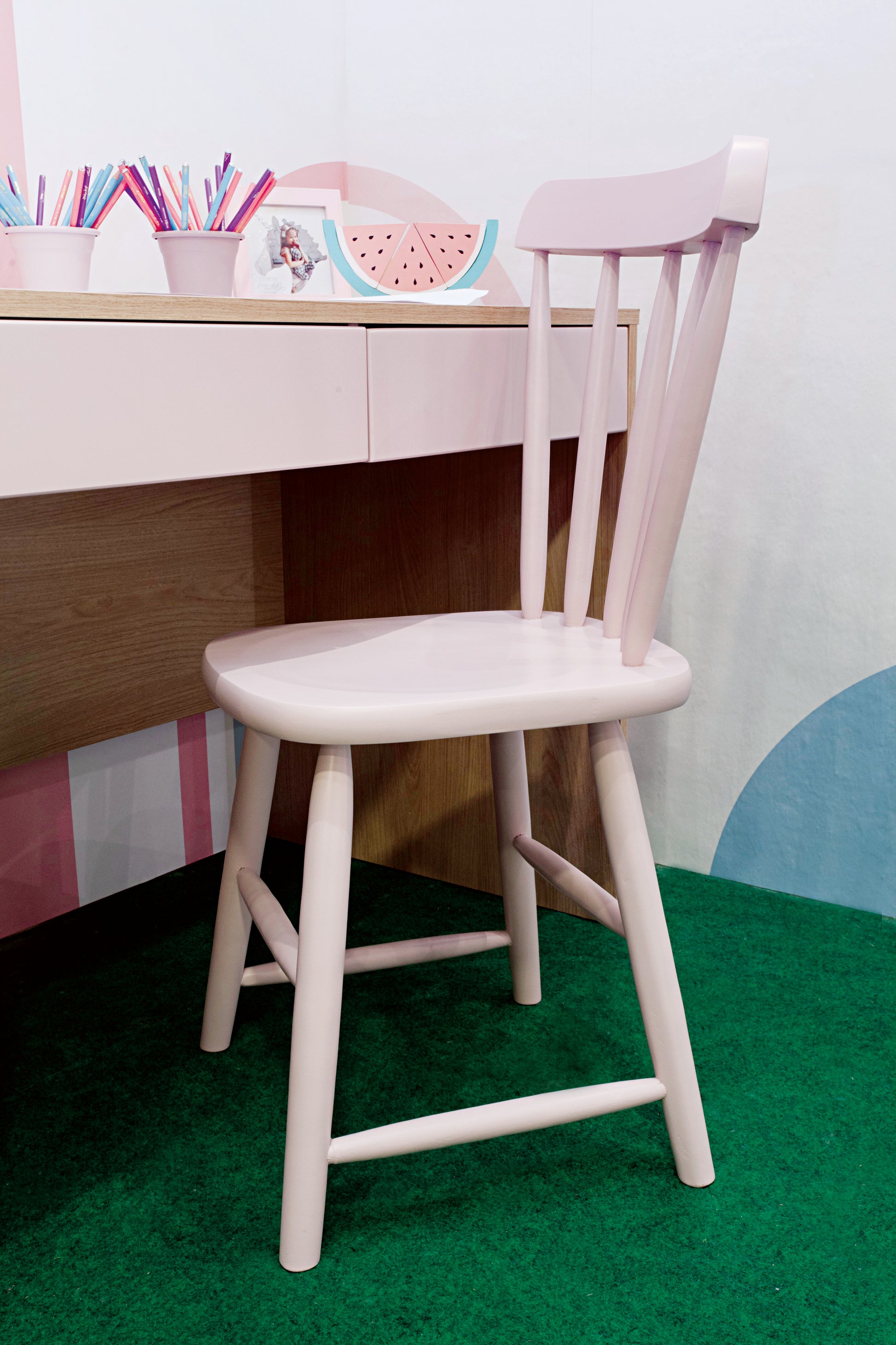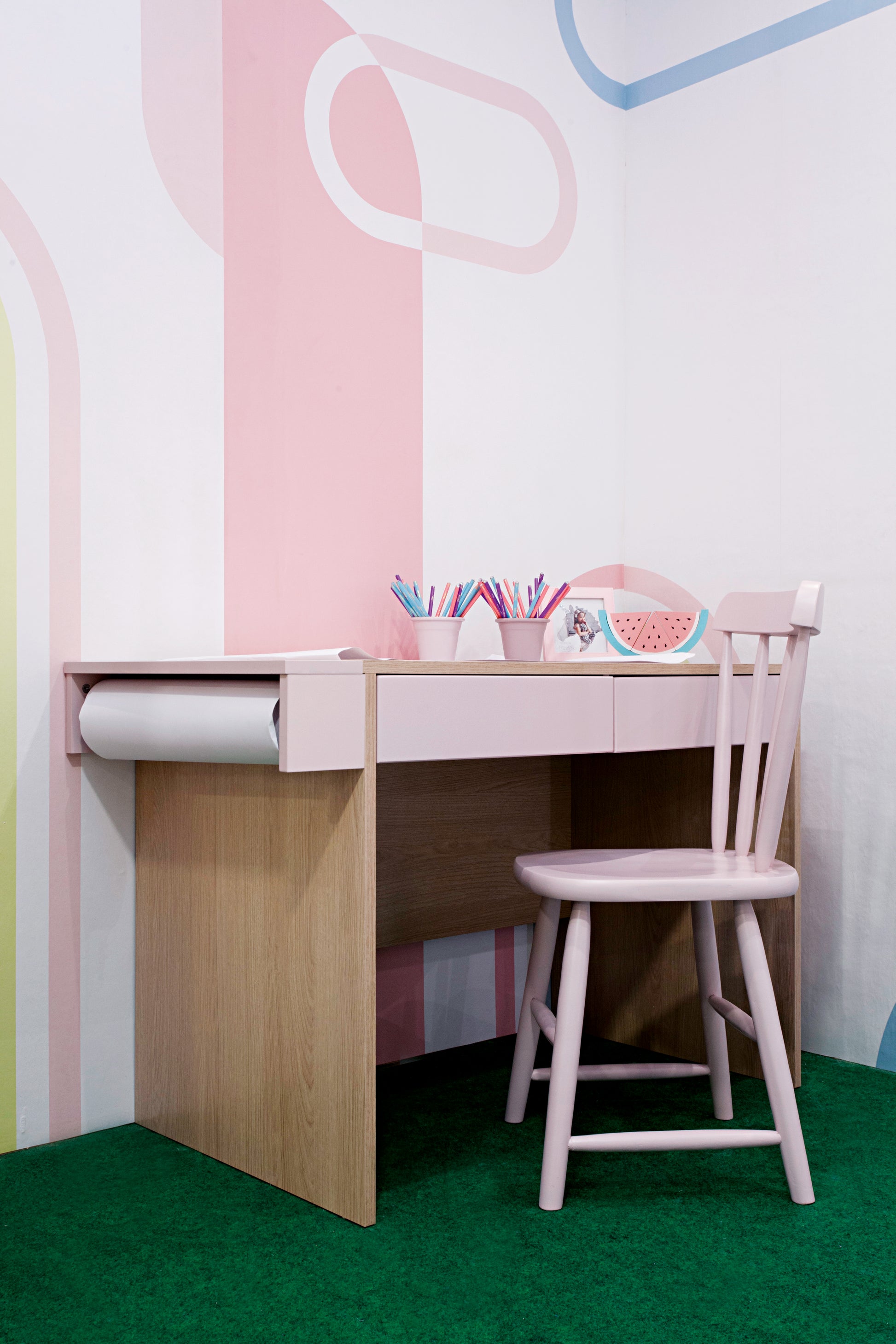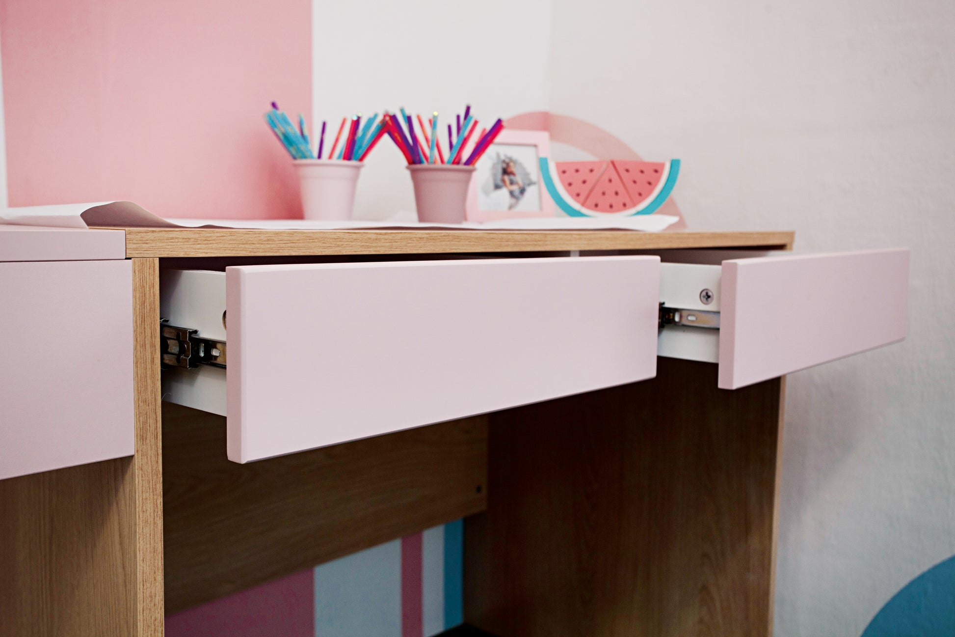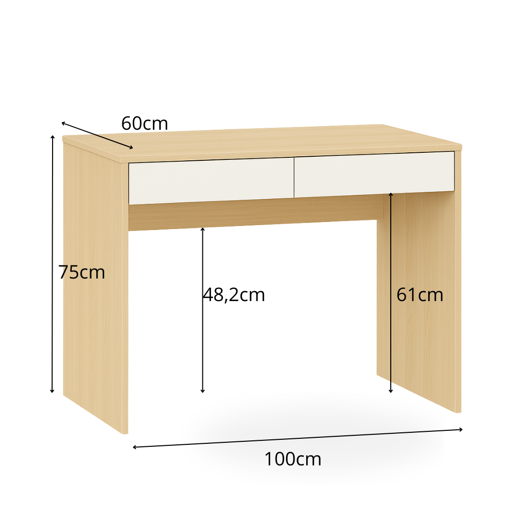 A escrivaninha é ótima para economizar espaço e criar um ambiente mais organizado no quarto infantil, escritórios ou quartos pequenos. Possui duas gavetas embutidas para armazenamento, pode ser usada como mesa de estudo, para os quartos de menina pode ser usado como penteadeira para maquiagem ou até mesmo como local de trabalho.