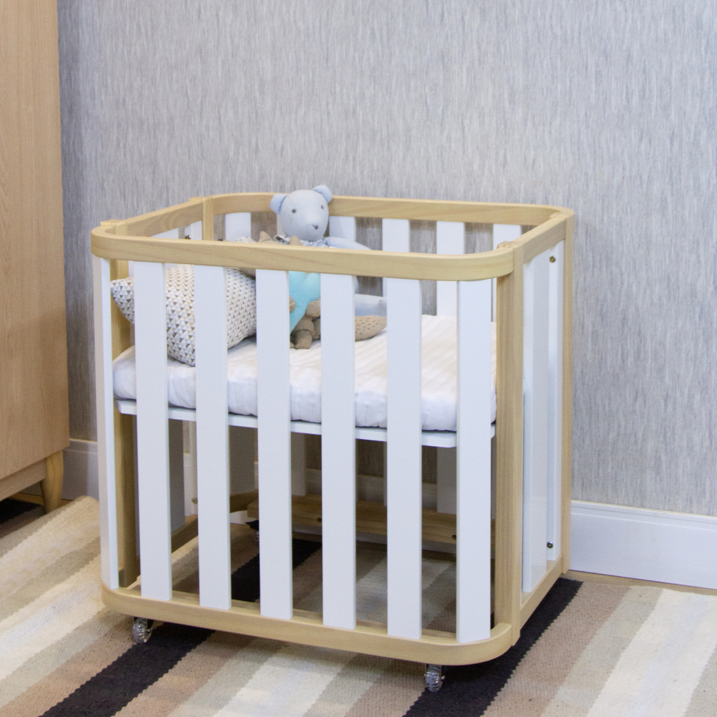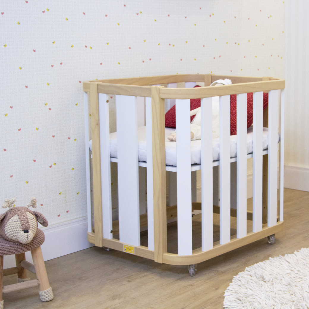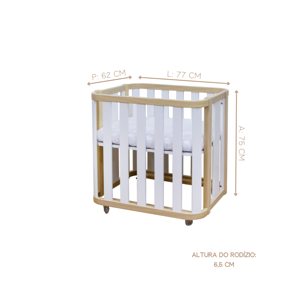 Mini Berço com Colchão e Rodízios Loop Branco com Madeira