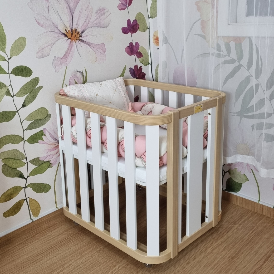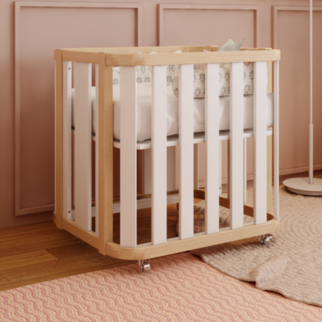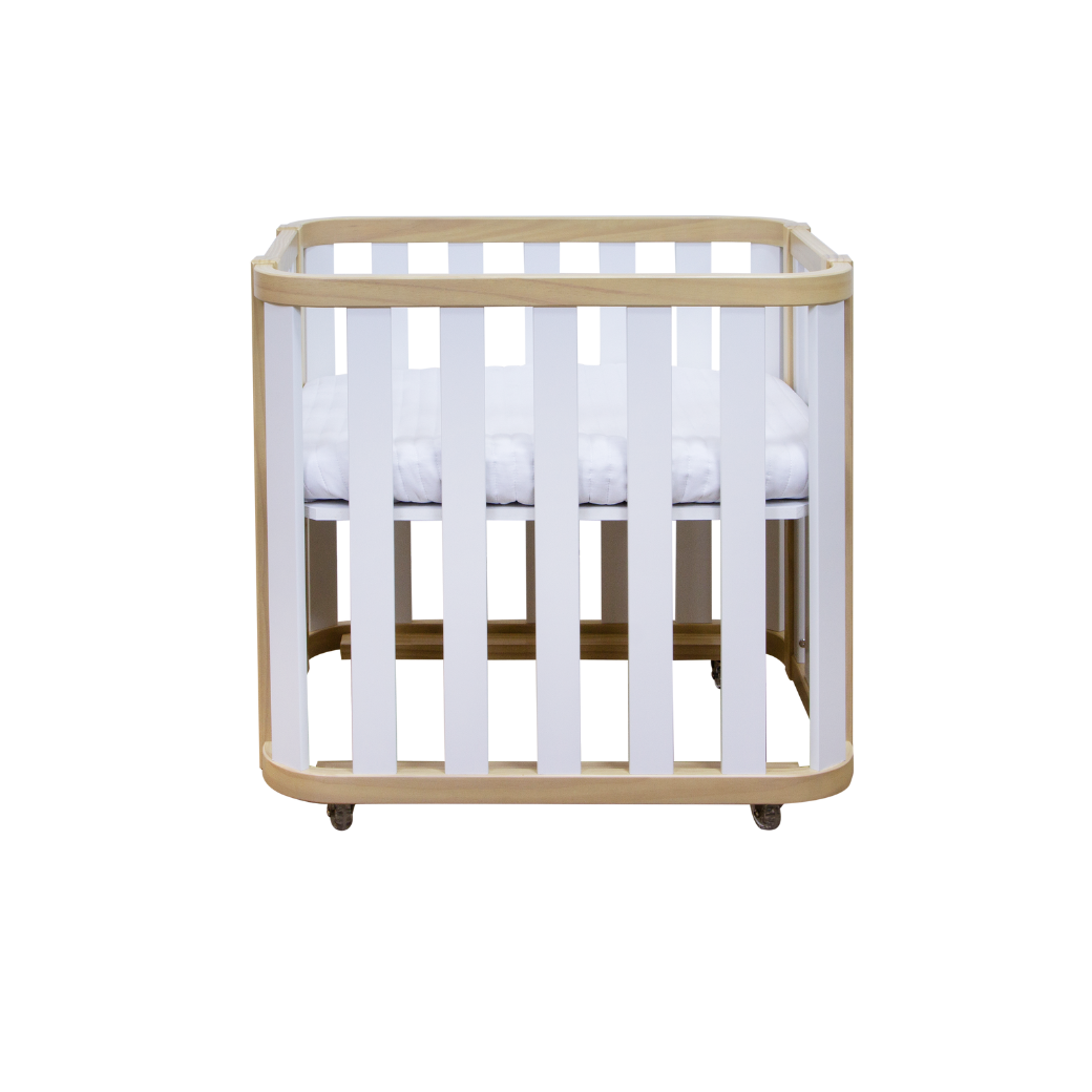 Mini Berço com Colchão e Rodízios Loop Branco com Madeira